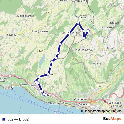 The first stop of the 382 bus route is Chexbres-Village, gare and the last stop is Palézieux, gare. 382 (B 382) is operational during an Werktagen.