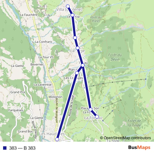 The first stop of the 383 bus route is Les Haudères, centre and the last stop is La Forclaz Vs. 383 (B 383) is operational during täglich.