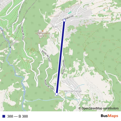 The first stop of the 388 bus route is Nax, centre and the last stop is Fontany. 388 (B 388) is operational during am Wochenende.