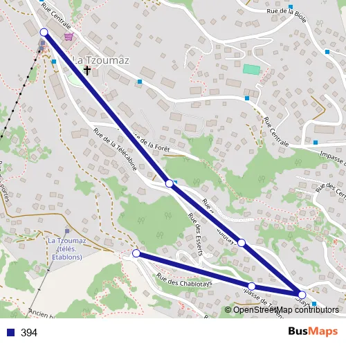The first stop of the 394 bus route is La Tzoumaz, télécabine and the last stop is La Tzoumaz, Baby Lift. 394 is operational during täglich.