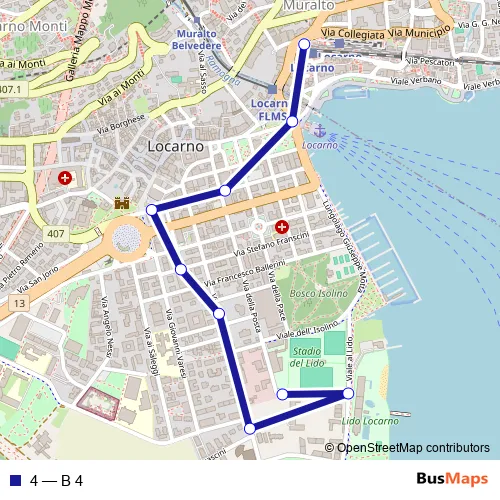 The first stop of the 4 bus route is Locarno, Residenza Lido and the last stop is Locarno, Stazione. 4 (B 4) is operational during täglich.