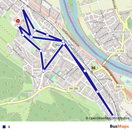 The first stop of the 4 bus route is Bad Zurzach, Bahnhof and the last stop is Bad Zurzach, Bahnhof. 4 is operational during täglich.