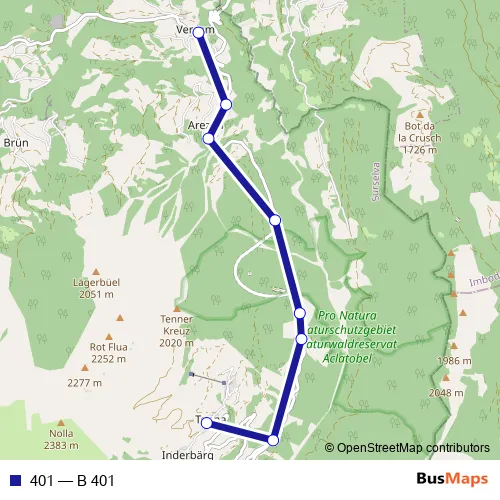 The first stop of the 401 bus route is Versam, Post and the last stop is Tenna, Mitte. 401 (B 401) is operational during an Werktagen.