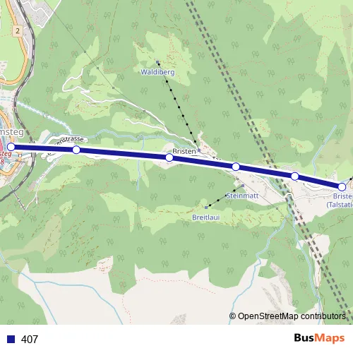 The first stop of the 407 bus route is Amsteg, Dorf and the last stop is Bristen, Talstation Golzern. 407 is operational during täglich.