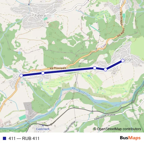 The first stop of the 411 bus route is Schluein, vitg and the last stop is Sagogn, Vitg dado. 411 (RUB 411) is operational during am Wochenende.