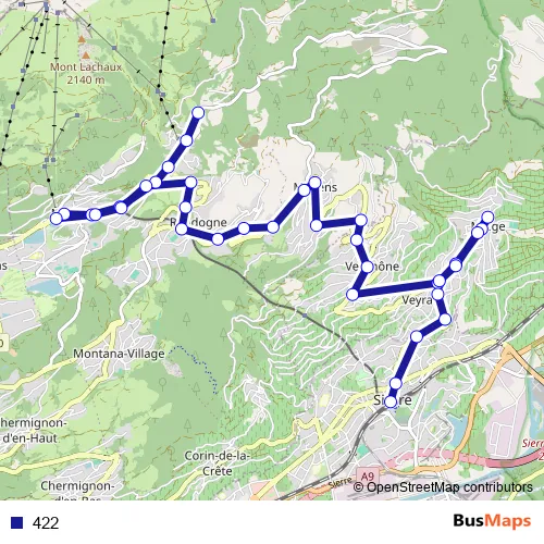 The first stop of the 422 bus route is Crans-Montana, Barzettes and the last stop is Sierre/Siders,Place de la gare. 422 is operational during täglich.