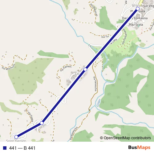 The first stop of the 441 bus route is Vrin, vitg and the last stop is Vrin, S. Giusep. 441 (B 441) is operational during täglich.