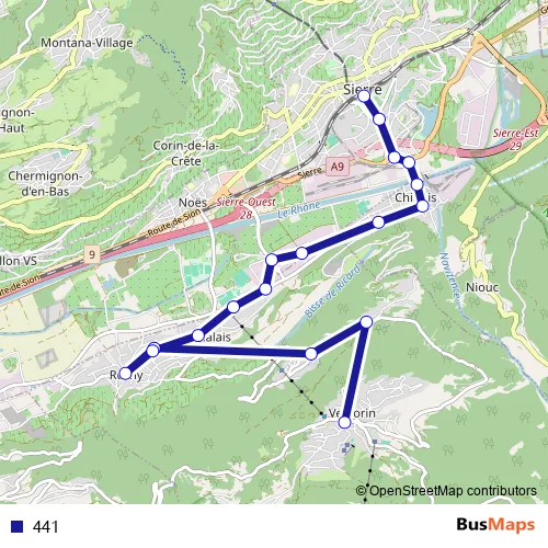 The first stop of the 441 bus route is Vercorin, poste and the last stop is Sierre/Siders, gare routière. 441 is operational during täglich.