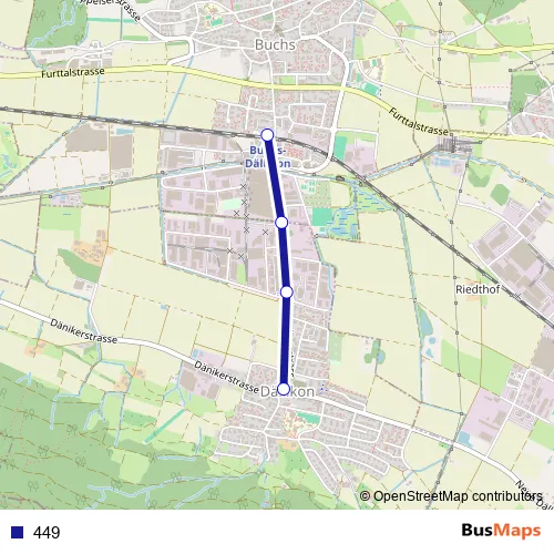 The first stop of the 449 bus route is Dällikon, Dorf and the last stop is Buchs-Dällikon, Bahnhof. 449 is operational during an Werktagen.