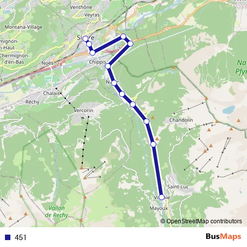 The first stop of the 451 bus route is Vissoie, poste and the last stop is Sierre/Siders, gare routière. 451 is operational during täglich.
