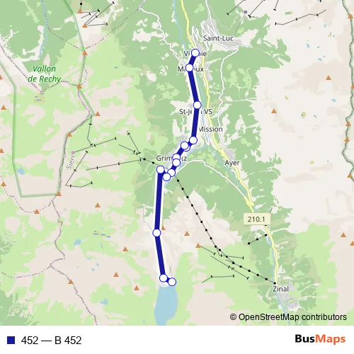 The first stop of the 452 bus route is Vissoie, poste and the last stop is Moiry VS, barrage. 452 (B 452) is operational during täglich.