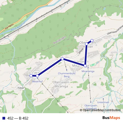 The first stop of the 452 bus route is Obersaxen, Affeier Kehrplatz and the last stop is Obersaxen, Meierhof Post. 452 (B 452) is operational during täglich.