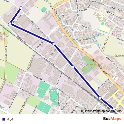 The first stop of the 454 bus route is Regensdorf, Allmend and the last stop is Regensdorf-Watt, Bahnhof. 454 is operational during an Werktagen.