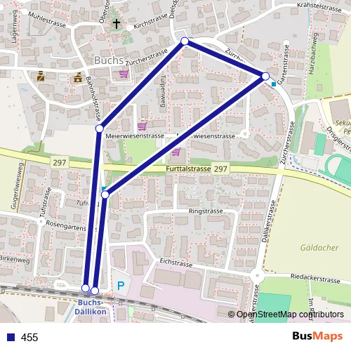 The first stop of the 455 bus route is Buchs-Dällikon, Bahnhof and the last stop is Buchs-Dällikon, Bahnhof. 455 is operational during an Werktagen.