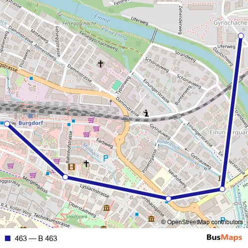 The first stop of the 463 bus route is Burgdorf, Gyrischachen and the last stop is Burgdorf, Bahnhof. 463 (B 463) is operational during täglich.