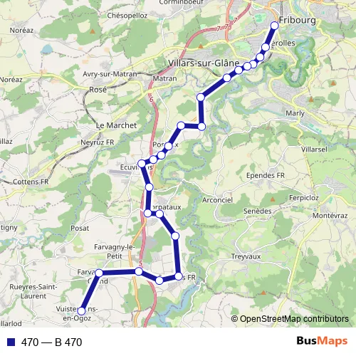The first stop of the 470 bus route is Fribourg/Freiburg, gare rout. and the last stop is Vuisternens-en-Ogoz, croisée. 470 (B 470) is operational during an Werktagen.