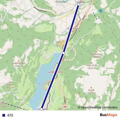 The first stop of the 470 bus route is Lungern, Dorfkapelle and the last stop is Giswil, Bahnhof. 470 is operational during an Werktagen.