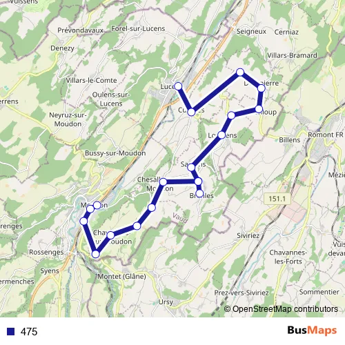The first stop of the 475 bus route is Moudon, gare and the last stop is Lucens, gare. 475 is operational during täglich.