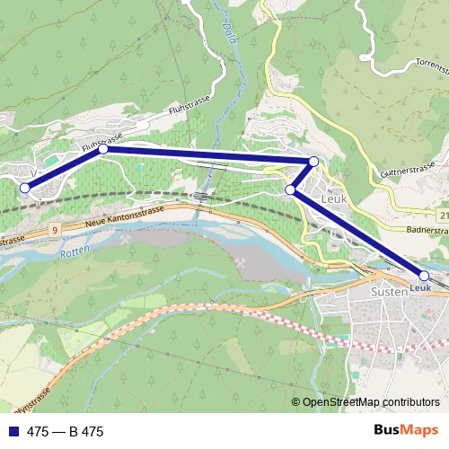 The first stop of the 475 bus route is Varen, Frayen and the last stop is Leuk, Bahnhof. 475 (B 475) is operational during täglich.