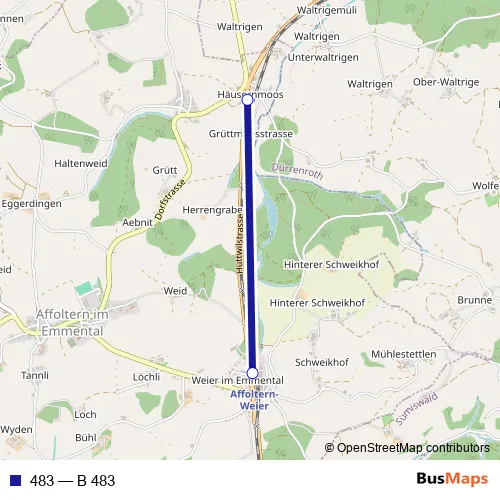 The first stop of the 483 bus route is Häusernmoos, Dorf and the last stop is Affoltern-Weier, Bahnhof. 483 (B 483) is operational during an Werktagen.
