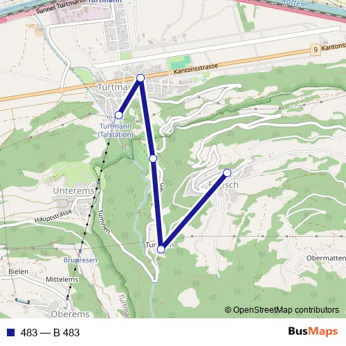 The first stop of the 483 bus route is Ergisch, Dorf and the last stop is Turtmann, Seilbahn Ltuo. 483 (B 483) is operational during an Werktagen.