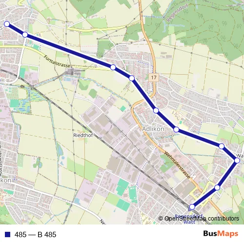 The first stop of the 485 bus route is Buchs ZH, Linde and the last stop is Regensdorf-Watt, Bahnhof. 485 (B 485) is operational during täglich.