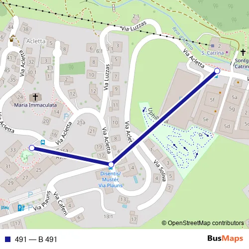 The first stop of the 491 bus route is Disentis/Mustér, Pendicularas and the last stop is Disentis/Mustér, Acletta. 491 (B 491) is operational during täglich.