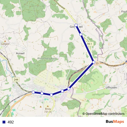 The first stop of the 492 bus route is Huttwil, Bahnhof and the last stop is Gondiswil, Gemeindehaus. 492 is operational during täglich.