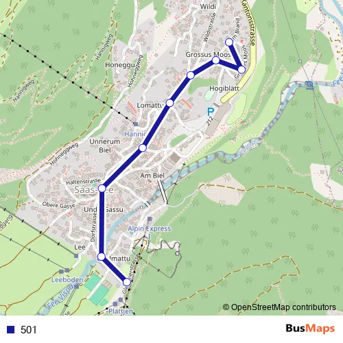 The first stop of the 501 bus route is Saas-Fee, Spielbodenbahn and the last stop is Saas-Fee, Sunnmattu. 501 is operational during täglich.