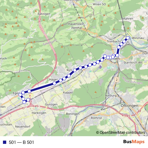 The first stop of the 501 bus route is Olten, Haslistrasse and the last stop is Egerkingen, Gäu Park. 501 (B 501) is operational during an Werktagen.