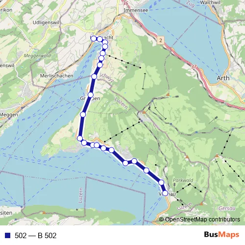 The first stop of the 502 bus route is Küssnacht am Rigi, Bahnhof and the last stop is Vitznau, Station. 502 (B 502) is operational during täglich.
