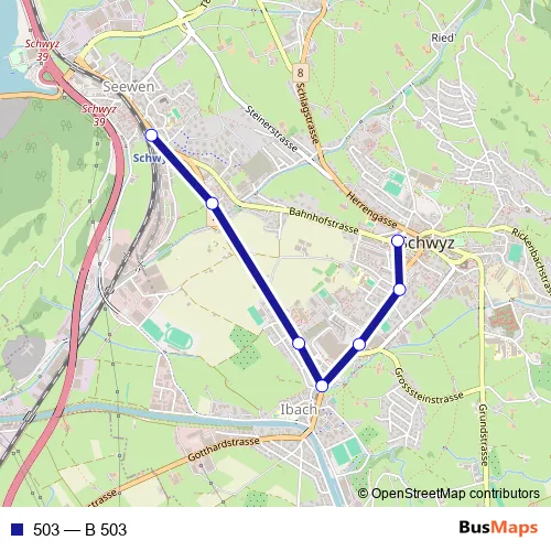 The first stop of the 503 bus route is Schwyz, Bahnhof and the last stop is Schwyz, Zentrum. 503 (B 503) is operational during täglich.