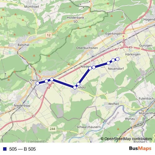 The first stop of the 505 bus route is Neuendorf, Unterdorf and the last stop is Oensingen, Bahnhof Süd. 505 (B 505) is operational during täglich.