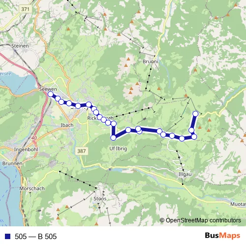The first stop of the 505 bus route is Schwyz, Bahnhof and the last stop is Ibergeregg, Passhöhe. 505 (B 505) is operational during täglich.