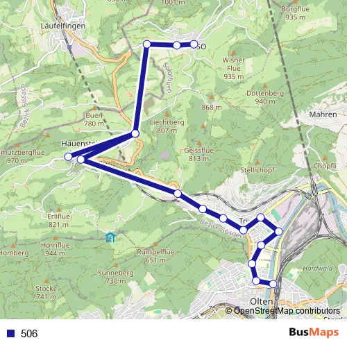 The first stop of the 506 bus route is Wisen SO, Kirche and the last stop is Olten, Bahnhof. 506 is operational during täglich.