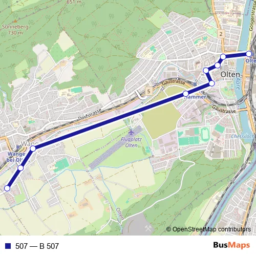 The first stop of the 507 bus route is Wangen b. Olten, Am Kreuzbach and the last stop is Olten, Bahnhof. 507 (B 507) is operational during täglich.