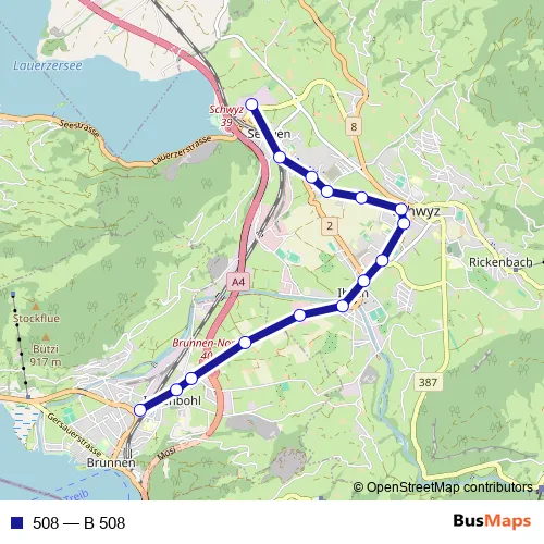 The first stop of the 508 bus route is Seewen SZ, Seewen Markt and the last stop is Brunnen, Bahnhof. 508 (B 508) is operational during täglich.