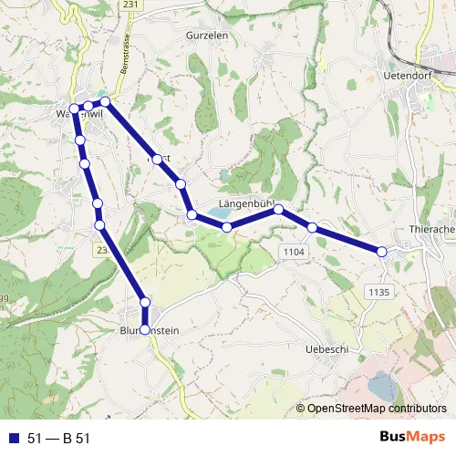 The first stop of the 51 bus route is Blumenstein, Dorf and the last stop is Thierachern, Wahlen. 51 (B 51) is operational during am Wochenende.
