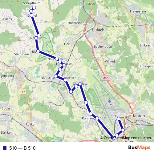 The first stop of the 510 bus route is Stadel b. N., Neuwis-Huus and the last stop is Zürich Flughafen, Bahnhof. 510 (B 510) is operational during täglich.