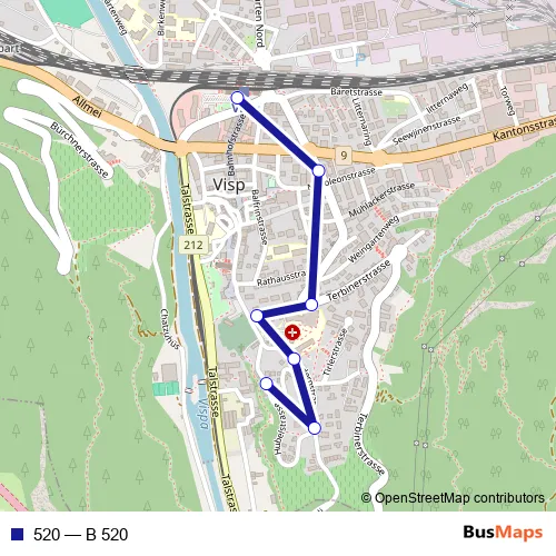 The first stop of the 520 bus route is Visp, Bahnhof Süd and the last stop is Visp, Hubelstrasse. 520 (B 520) is operational during täglich.