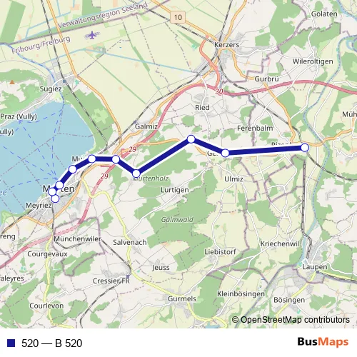 The first stop of the 520 bus route is Murten/Morat, Bahnhof and the last stop is Gümmenen, Bahnhof. 520 (B 520) is operational during an Werktagen.