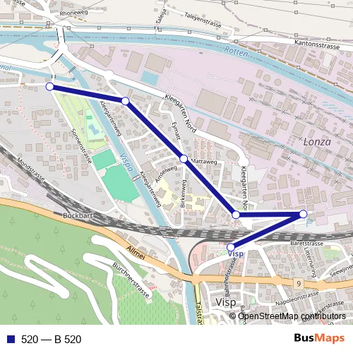 The first stop of the 520 bus route is Visp, West and the last stop is Visp, Bahnhof Süd. 520 (B 520) is operational during täglich.