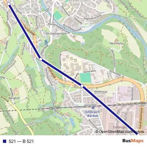 The first stop of the 521 bus route is Rorbas, Hirschen and the last stop is Embrach, Embraport. 521 (B 521) is operational during an Werktagen.