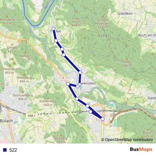 See why over 2 million users trust and consider busmaps.com as the best public transport website. busmaps gives you Buelach Buses suggested routes, real-time bus tracker, line route maps in Buelach, and helps to find the closest 522 bus stops near you. No internet available? Download an offline PDF map and bus schedule for the 522 bus to take on your trip.