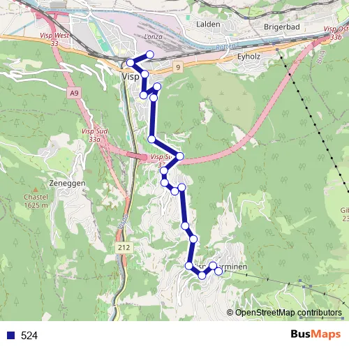 The first stop of the 524 bus route is Visp, Lonzawerke and the last stop is Visperterminen, Busterminal. 524 is operational during täglich.