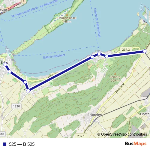 The first stop of the 525 bus route is Erlach, Stedtli and the last stop is Lüscherz, Bahnhof. 525 (B 525) is operational during an Werktagen.