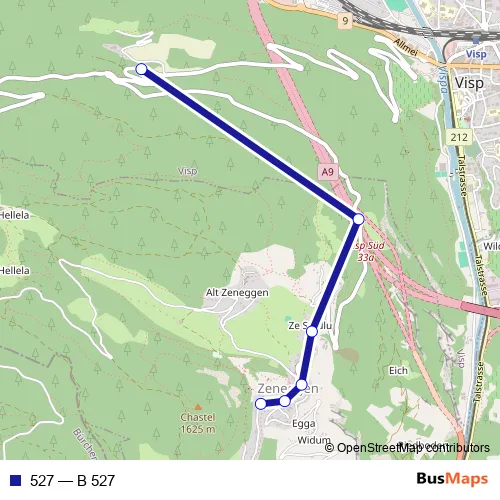 The first stop of the 527 bus route is Visp, Forsthaus and the last stop is Zeneggen, Tola. 527 (B 527) is operational during täglich.
