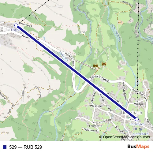 The first stop of the 529 bus route is Unterbäch (Bergstation) and the last stop is Eischoll (Bergstation). 529 (RUB 529) is operational during täglich.