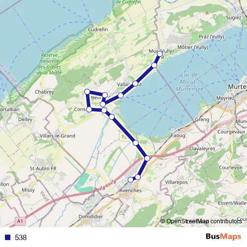 The first stop of the 538 bus route is Mur, village and the last stop is Avenches, gare. 538 is operational during täglich.