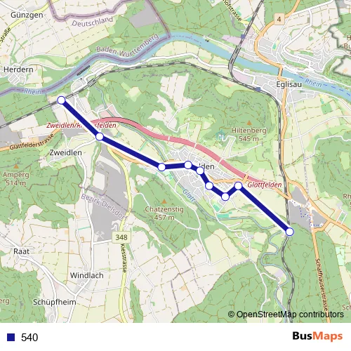 The first stop of the 540 bus route is Glattfelden, Bahnhof and the last stop is Zweidlen, Bahnhof. 540 is operational during täglich.